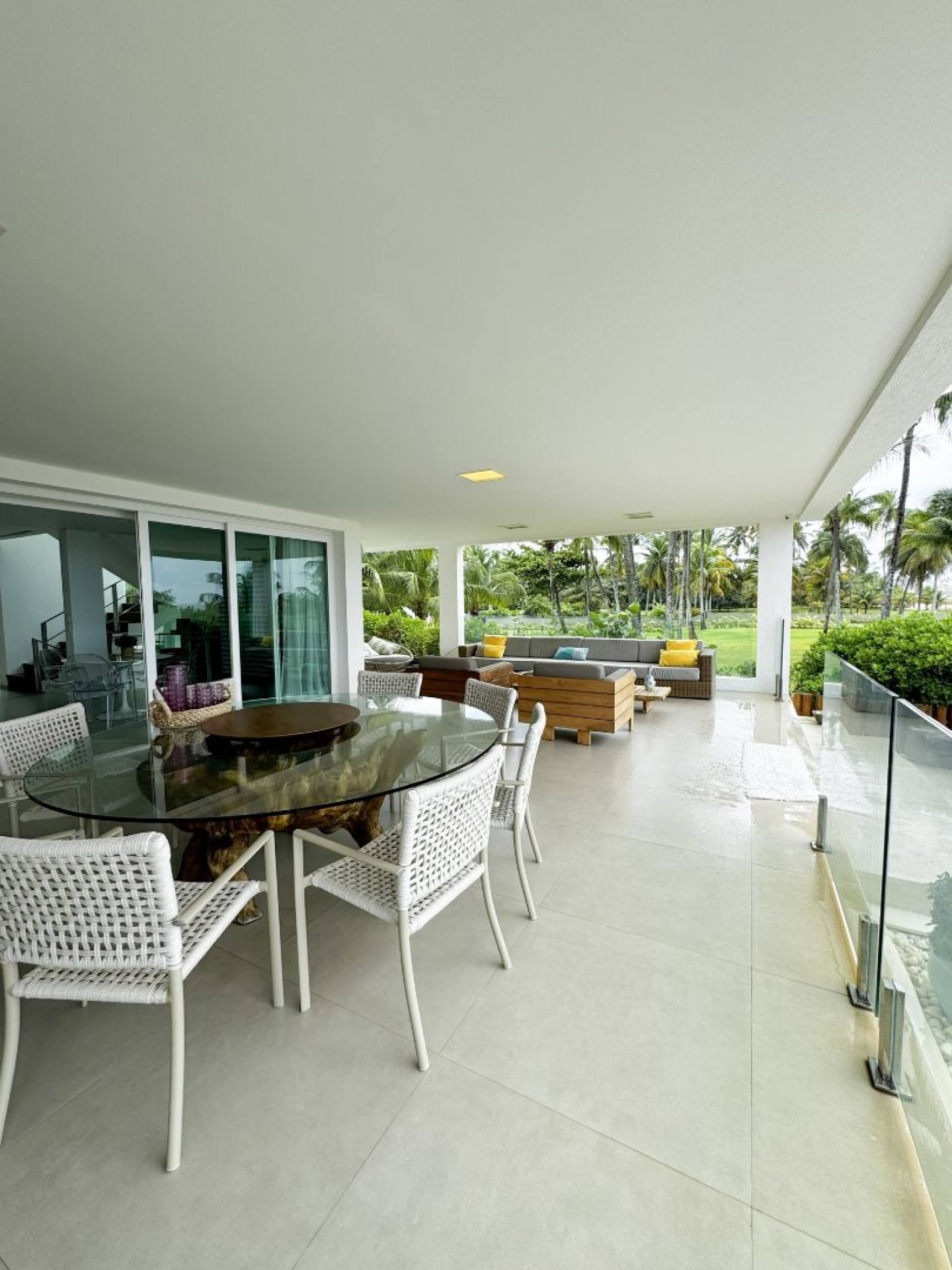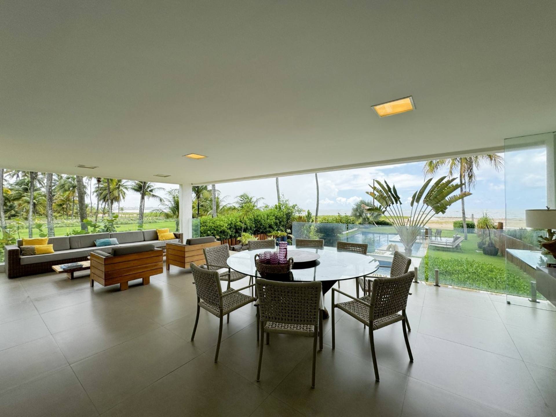 A área social impressiona com uma sala de estar com pé-direito duplo, que valoriza a iluminação natural e integra os ambientes de forma harmoniosa, criando uma atmosfera moderna e acolhedora. Para momentos de lazer e relaxamento, a casa dispõe de duas piscinas, sendo uma delas com jacuzzi e aquecimento, além de sauna e spa, formando um verdadeiro refúgio particular à beira-mar.